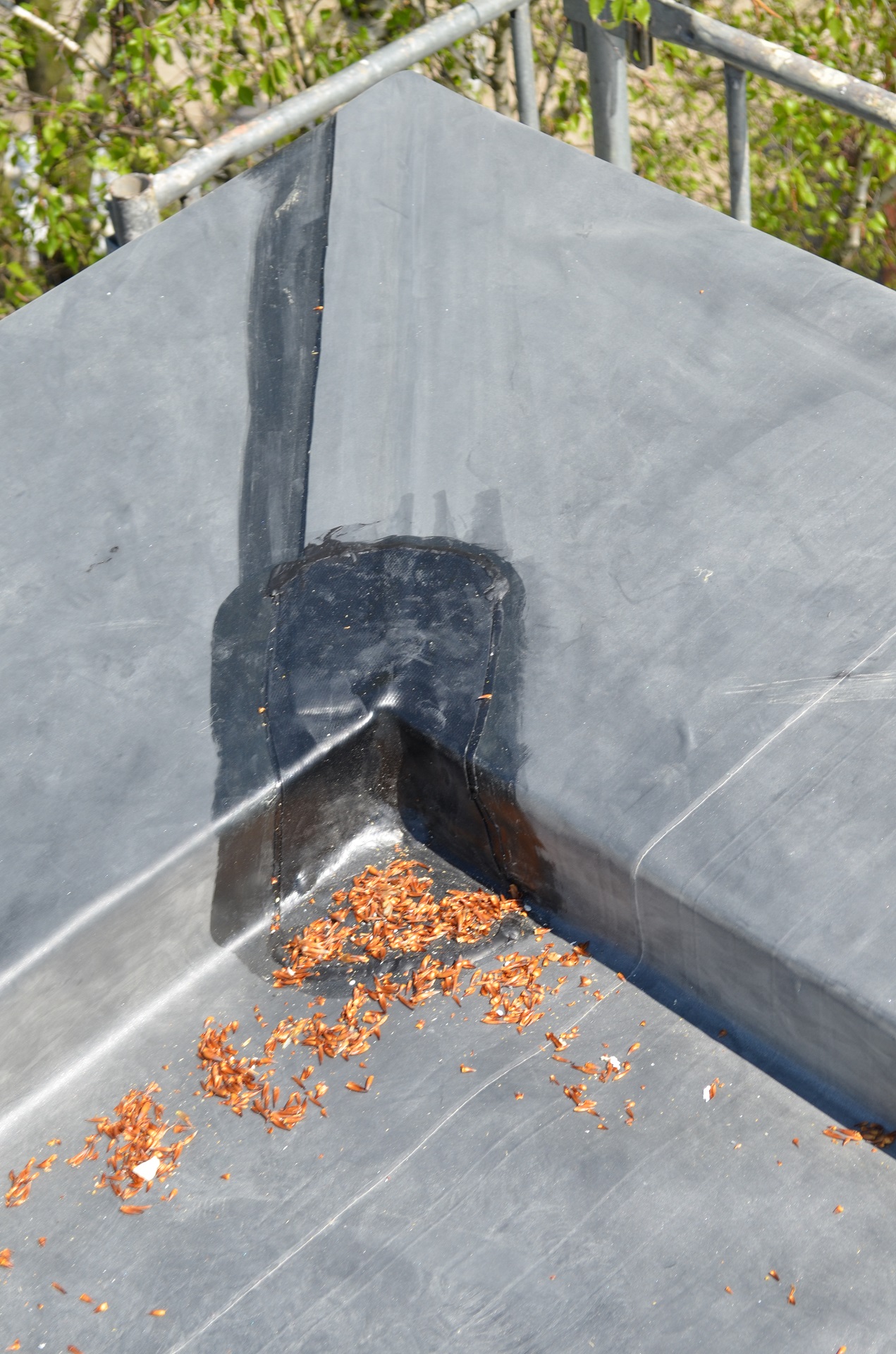 - Zatížený systém kačírkem, atika oblepena EPDM včetně okapničky, skládané rohy. Dvě výškové úrovně střech spojené za okapničkou vyšší střechy - celá střecha je ze dvou kusů EPDM membrány.